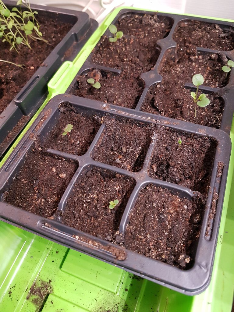 Puutarhamansikan siementen itävyys on ollut epätasaista, eikä ole ensimmäinen kerta. Mitenköhän haksahdin taas tähän? Mansikka olisi hyvä pitää mandollisimman pitkään suojattuna niin, että pintamulta, jossa siemenet ovat, ei pääse kuivahtamaan. Kuukausimansikat ovat itäneet hyvin, mutta kasvu on hidasta. Jättiverbenan siemenistä itää 4, olisinkohan kylvänyt 5. Yksi on vielä sirkkalehdillä, koska se iti vähän myöhemmin kuin muut. Selvästi pampaheinän siemenet ovat kylväytyneet myös muualle kuin omaan kylvöastiaan. Latva-artisokat näyttävät voivan hyvin, ovat toipuneet ensimmäisestä koulimisesta ja uusi lehti näyttää puskevan esille ensimmäisen lehtiparin takaa. Orvokit ovat myös vanhasta siemenpussista, eikä itävyys ole huippuluokkaa. Kalliopuutarhan perennasekoitus -siemenet ovat yksi mysteeri, sillä siemenpussissa on 0 % tekstimuotoista tietoa, mitä siemeniä pussissa on. Etupuolella on kuitenkin kuva, jonka perusteella ajattelin pussin sisältävän kuvassa näkyviä lajeja.